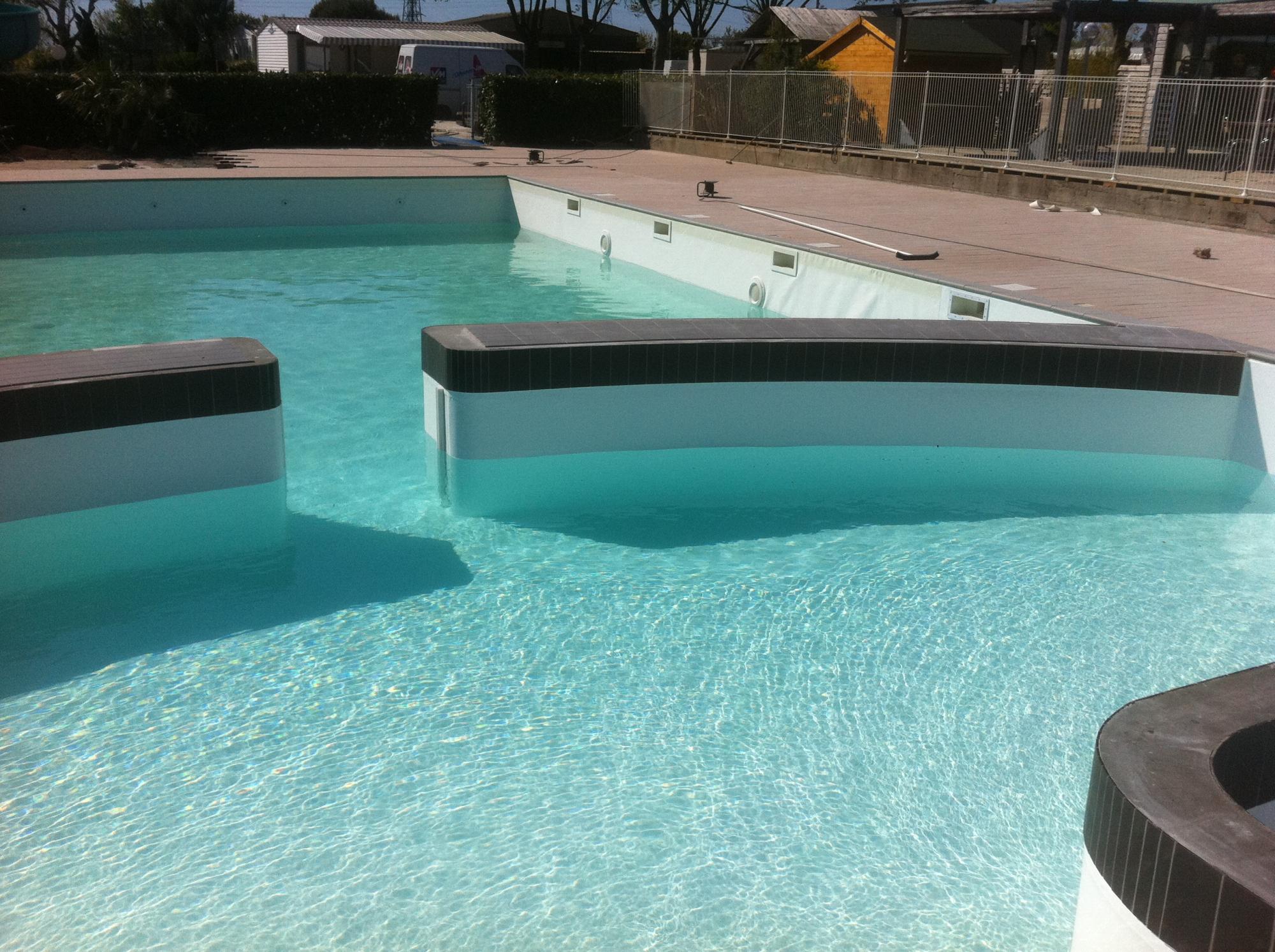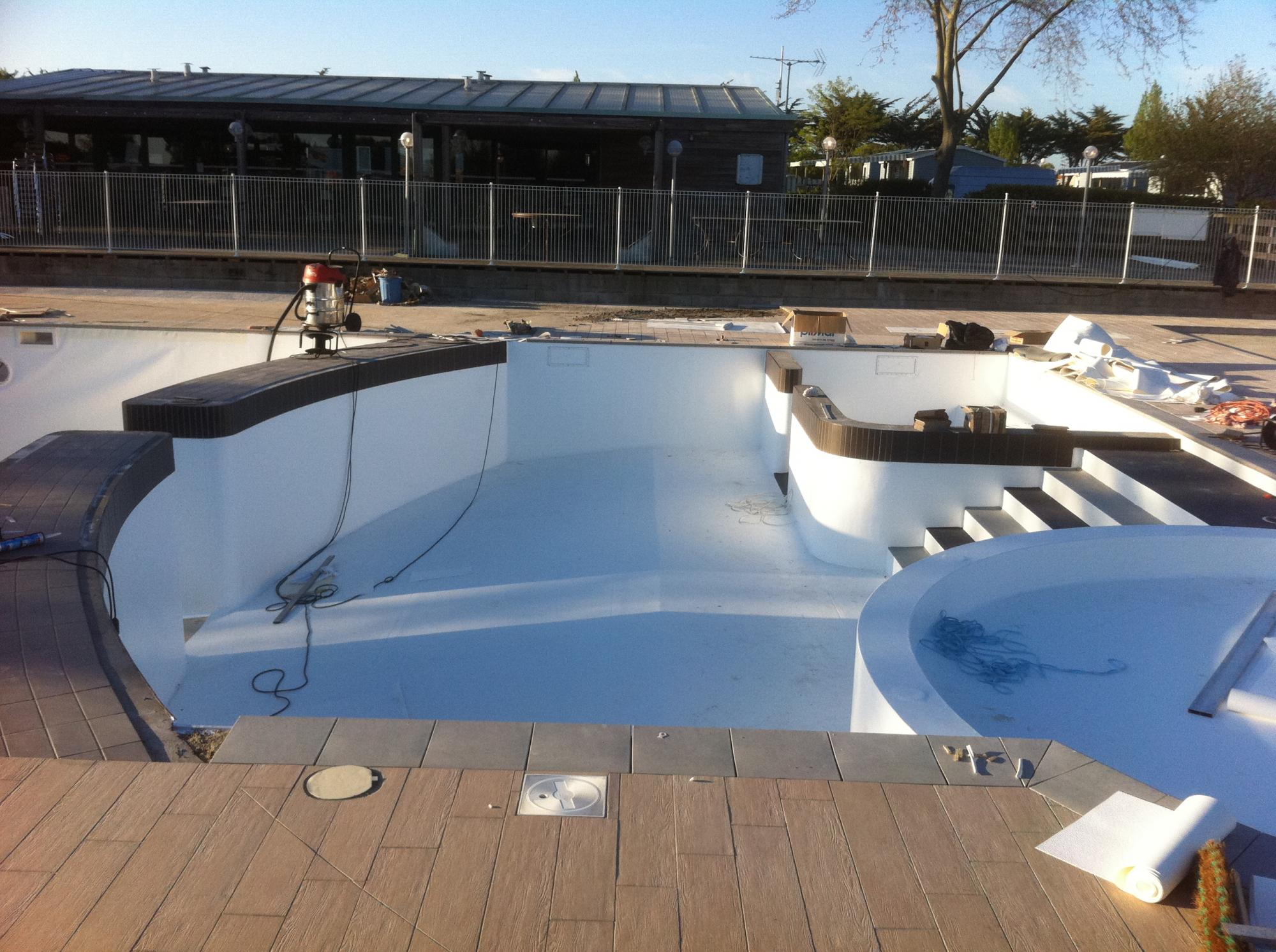 Réalisations › Piscines de campings / résidences › Pose liner armé complexe : piscine sur mesure aux formes atypiques