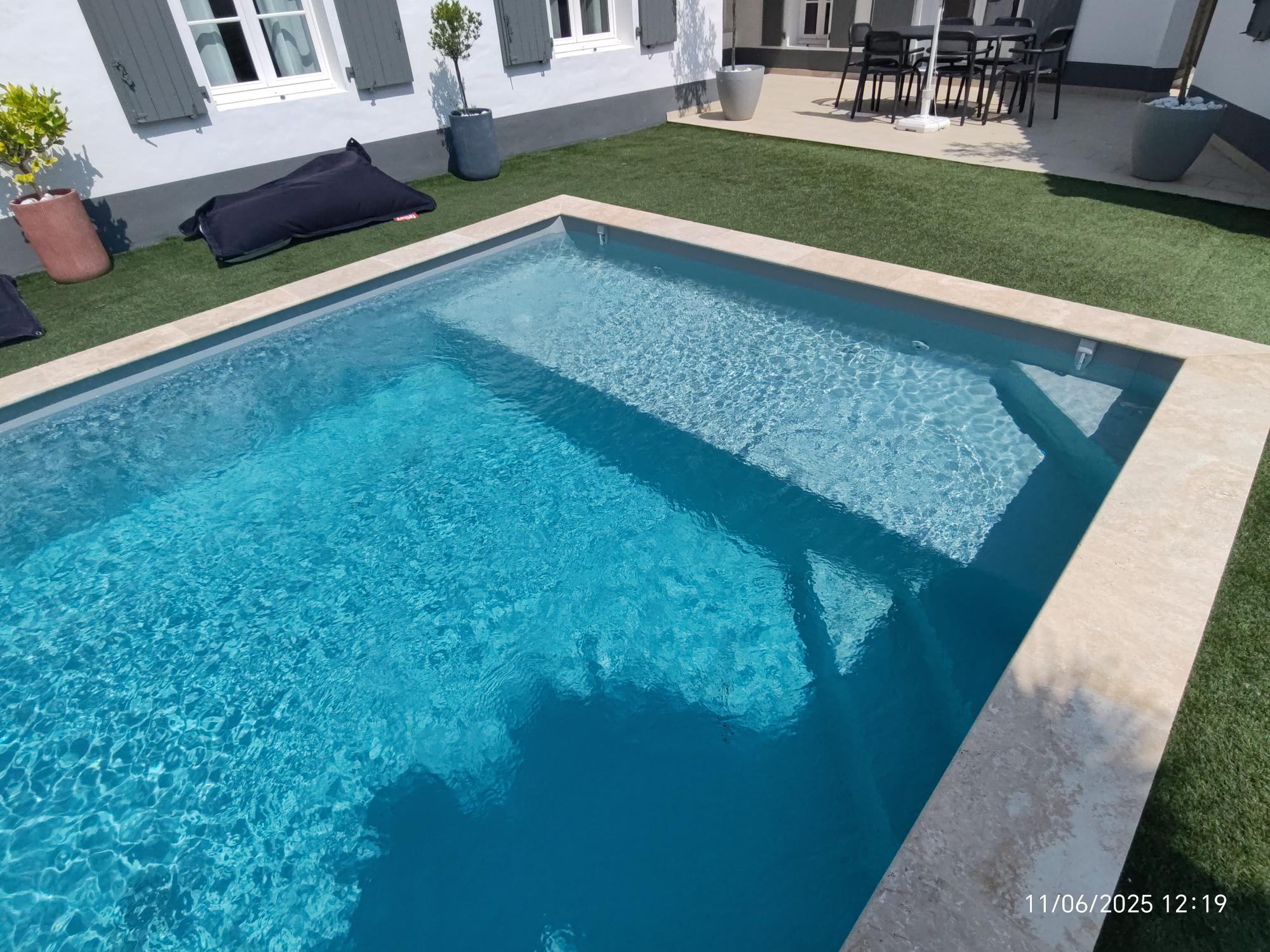 L’ancien liner 75/100ème, âgé de plus de 15 ans, a été remplacé par un liner armé 150/100ème gris pâle, offrant une étanchéité renforcée, une excellente durabilité et un rendu esthétique moderne.