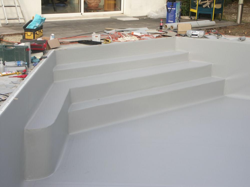 - La diversité des formes : contrairement au liner 75/100ème préparé en usine sous la forme d'une poche suivant les cottes du bassin, le liner armé est conditionné en rouleaux, puis il est découpé et soudé directement sur place, ce qui permet d’habiller toutes formes de piscines et escaliers en tous genres (voir photos) ; le liner armé est donc incontournable pour les bassins avec des formes arrondies, pour les piscines à débordement, ainsi que les piscines avec bacs pour volet de sécurité.